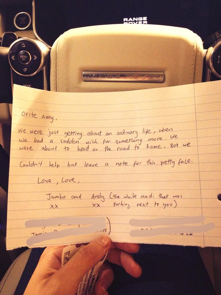 • Szintn twitteren osztotta meg ezt a kpet az autja szlvdjn hagyott cetlirl, amin a rajongi a dalai cmeibl gyrtottak neki zenetet.